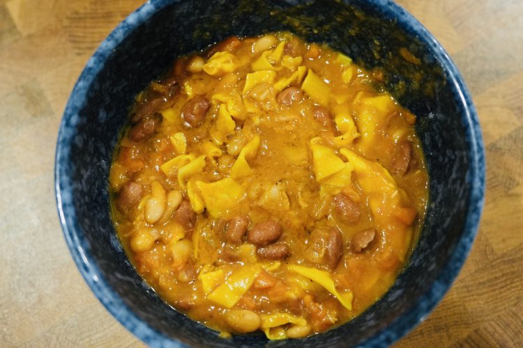 - Add the beans and pour in enough water or broth to cover everything. Add the herbs, Parmesan rind, salt, and pepper. Simmer for about 2 hours.