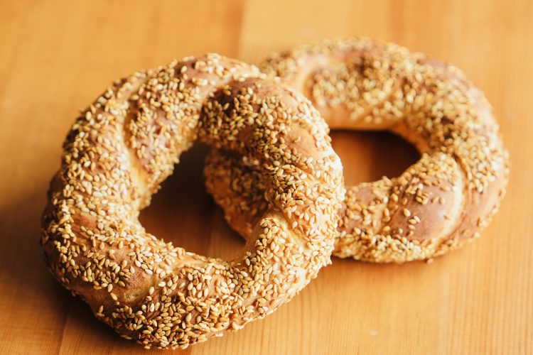 - Dip each simit ring into the molasses bath, then coat thoroughly with toasted sesame seeds.